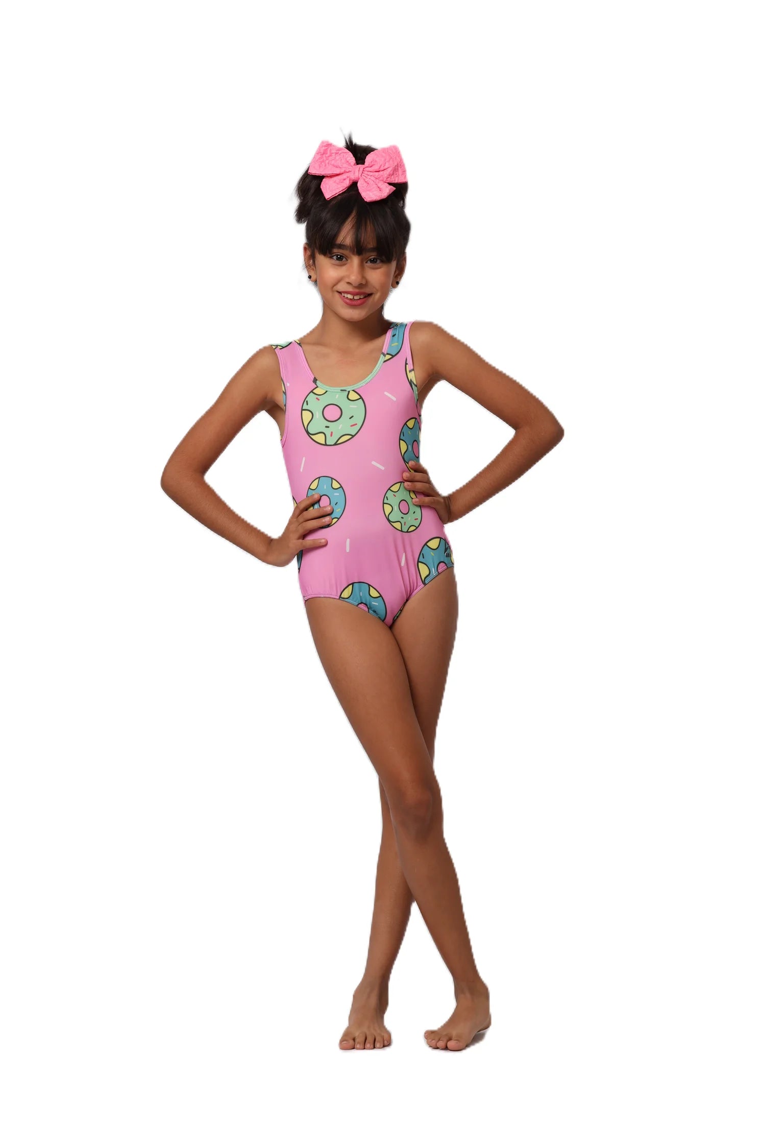 Young girl wearing a pink swimsuit with donut pattern on a white background