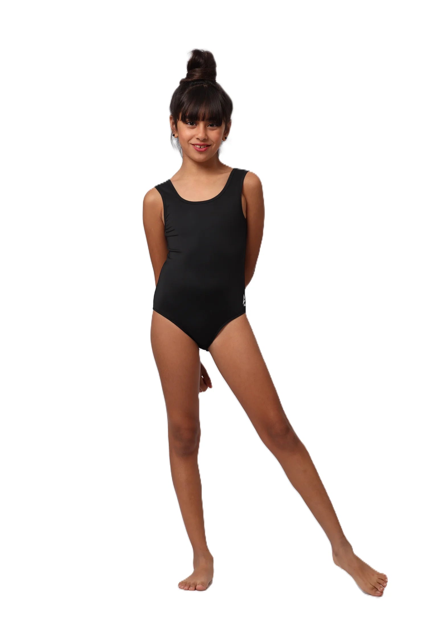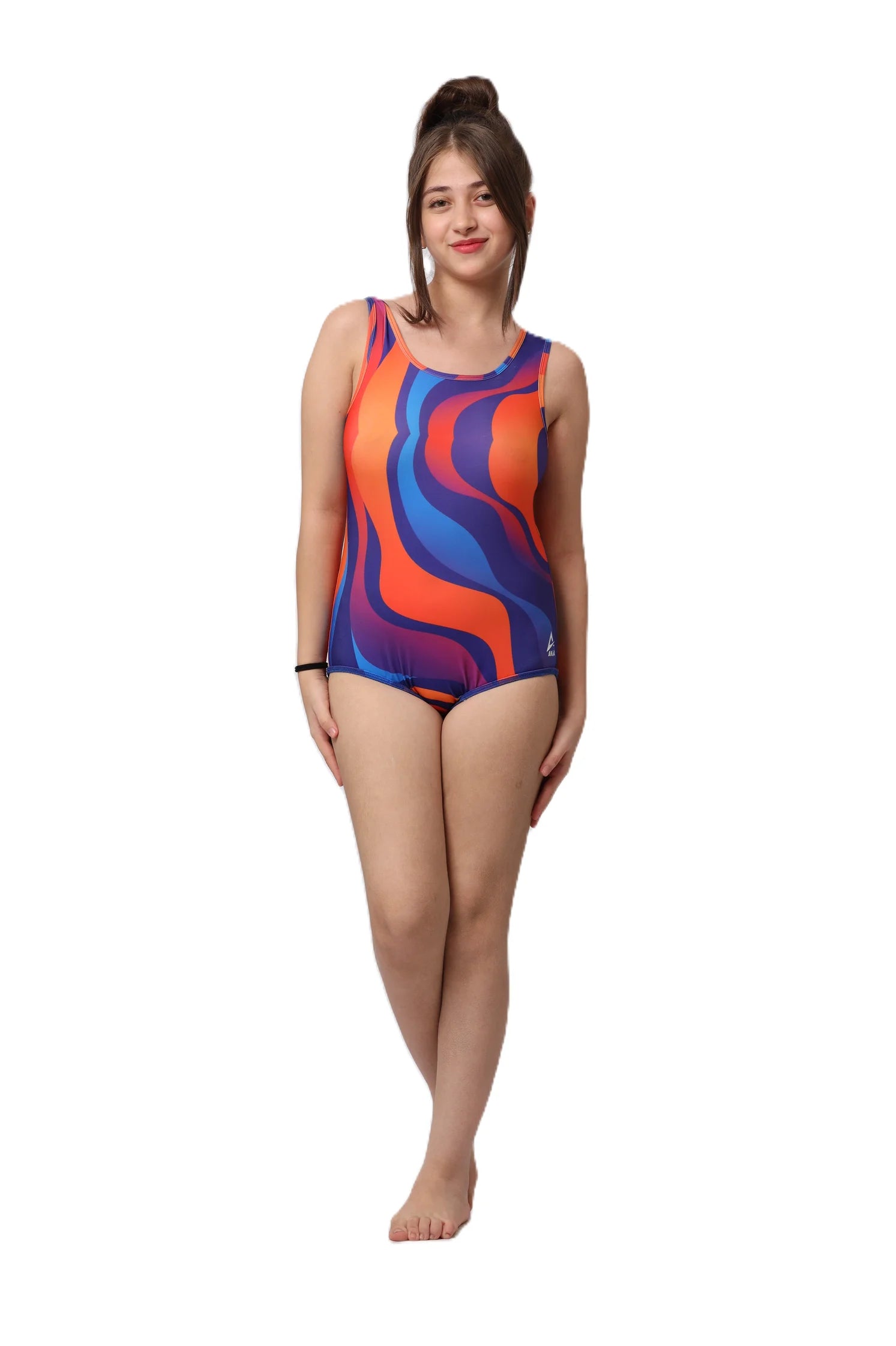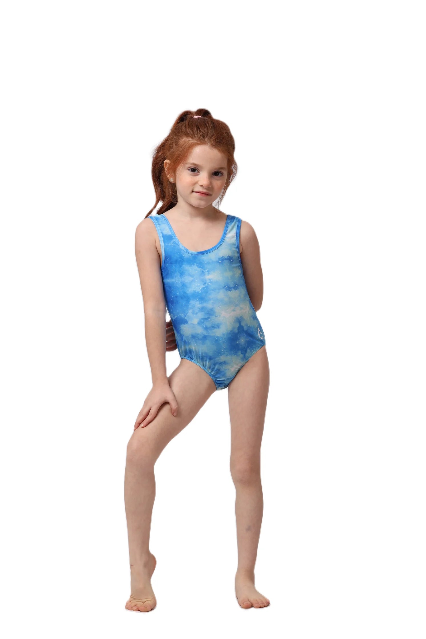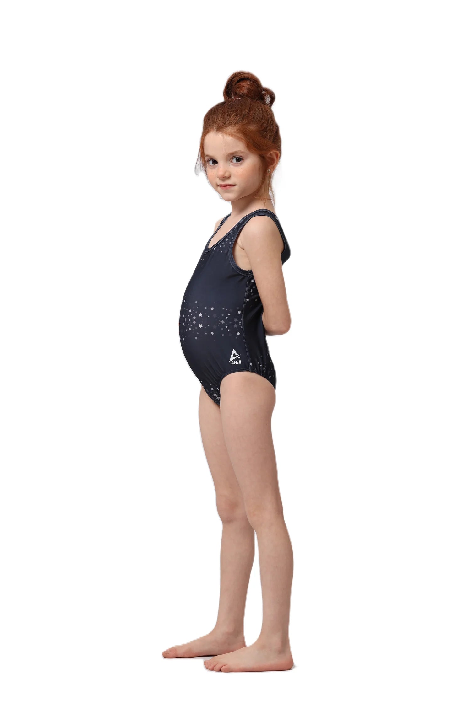 Young girl in a floral swimsuit standing with arms outstretched on a white background