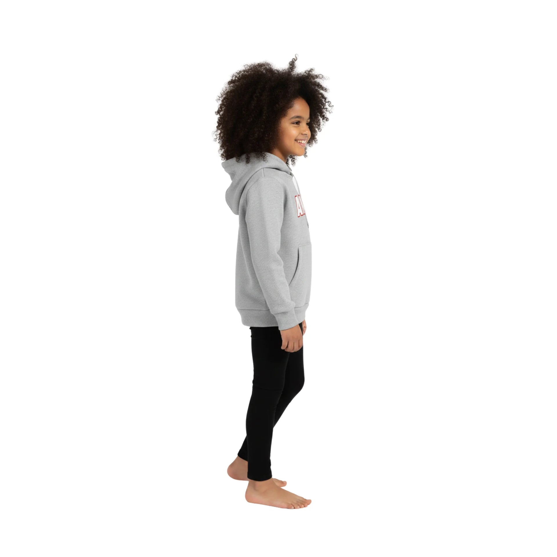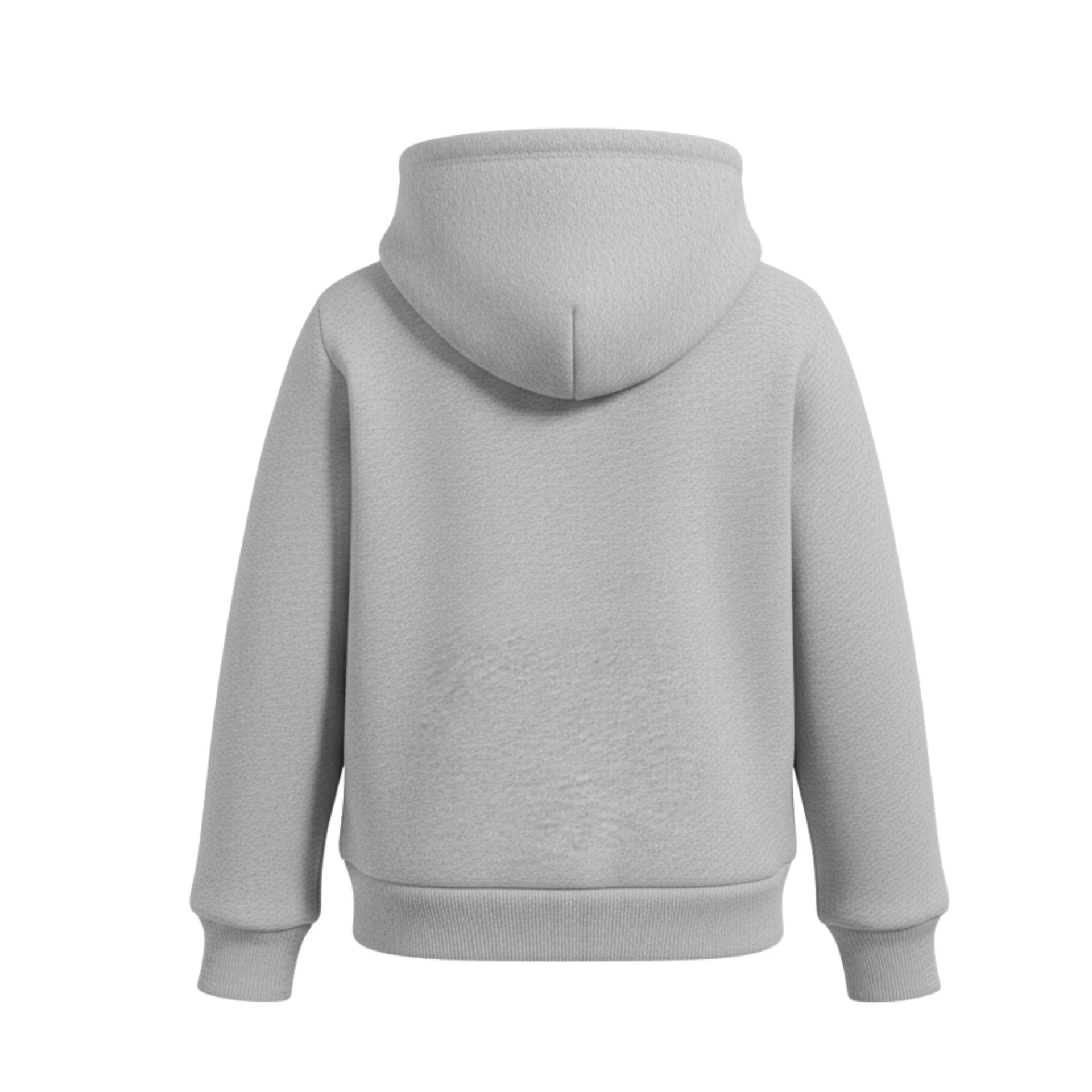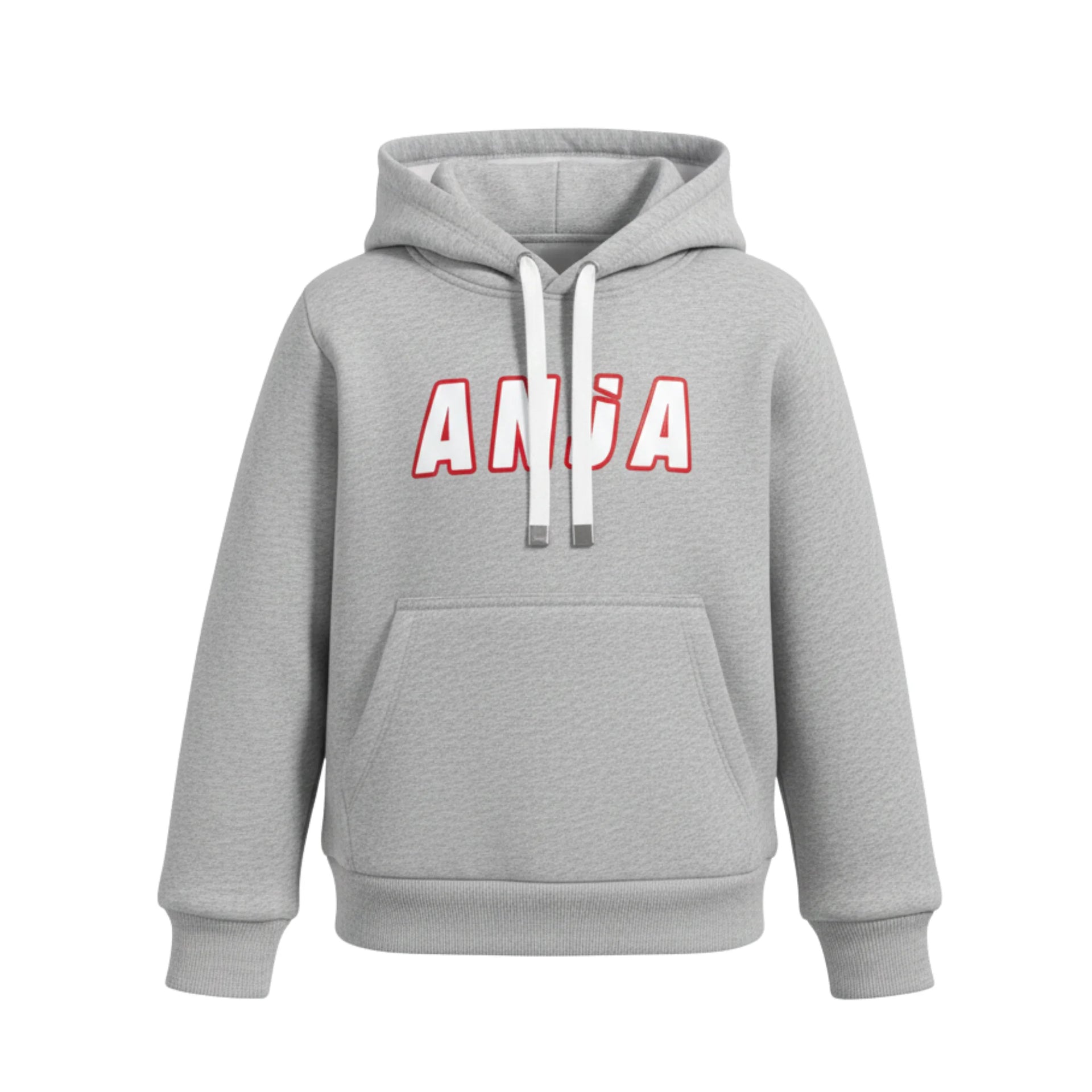 Child wearing a gray hoodie with 'ANJA' printed on it against a white background