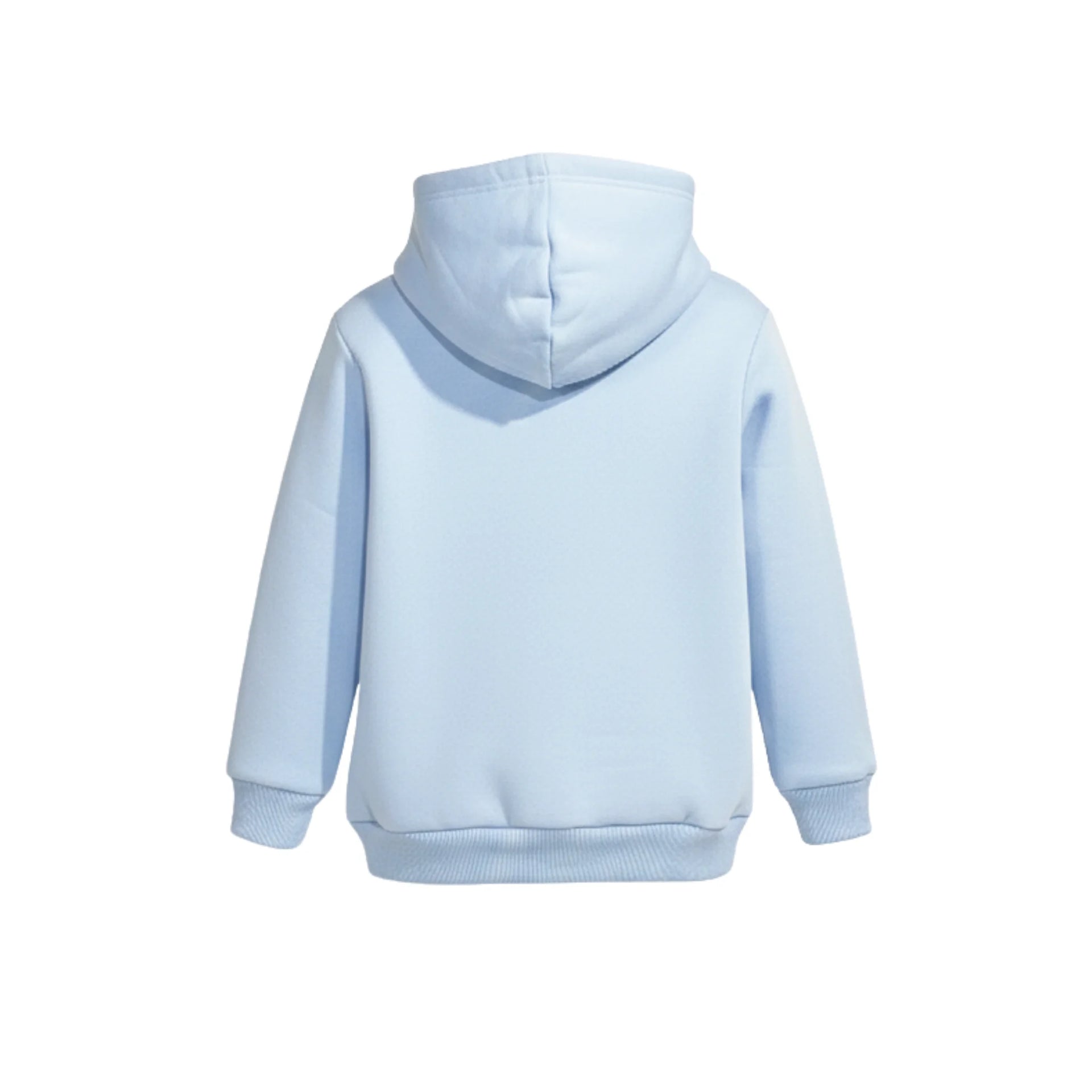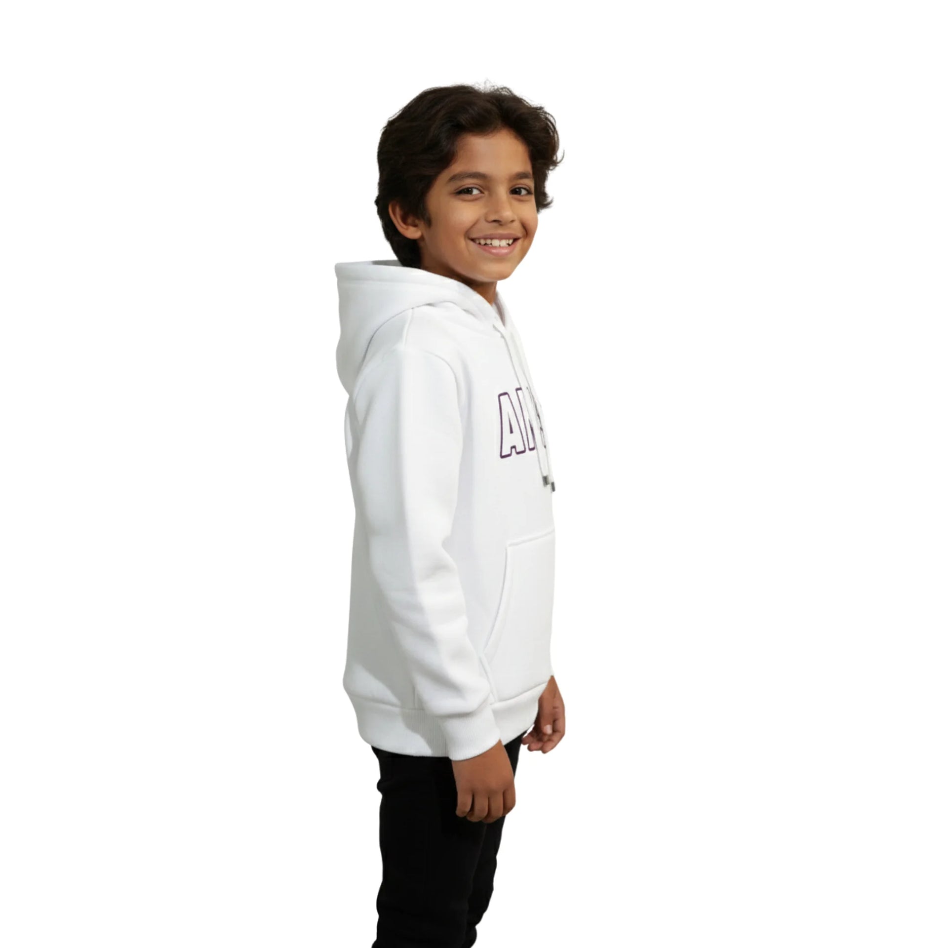 Child wearing a light blue hoodie with 'AMIA' printed on it against a white background
