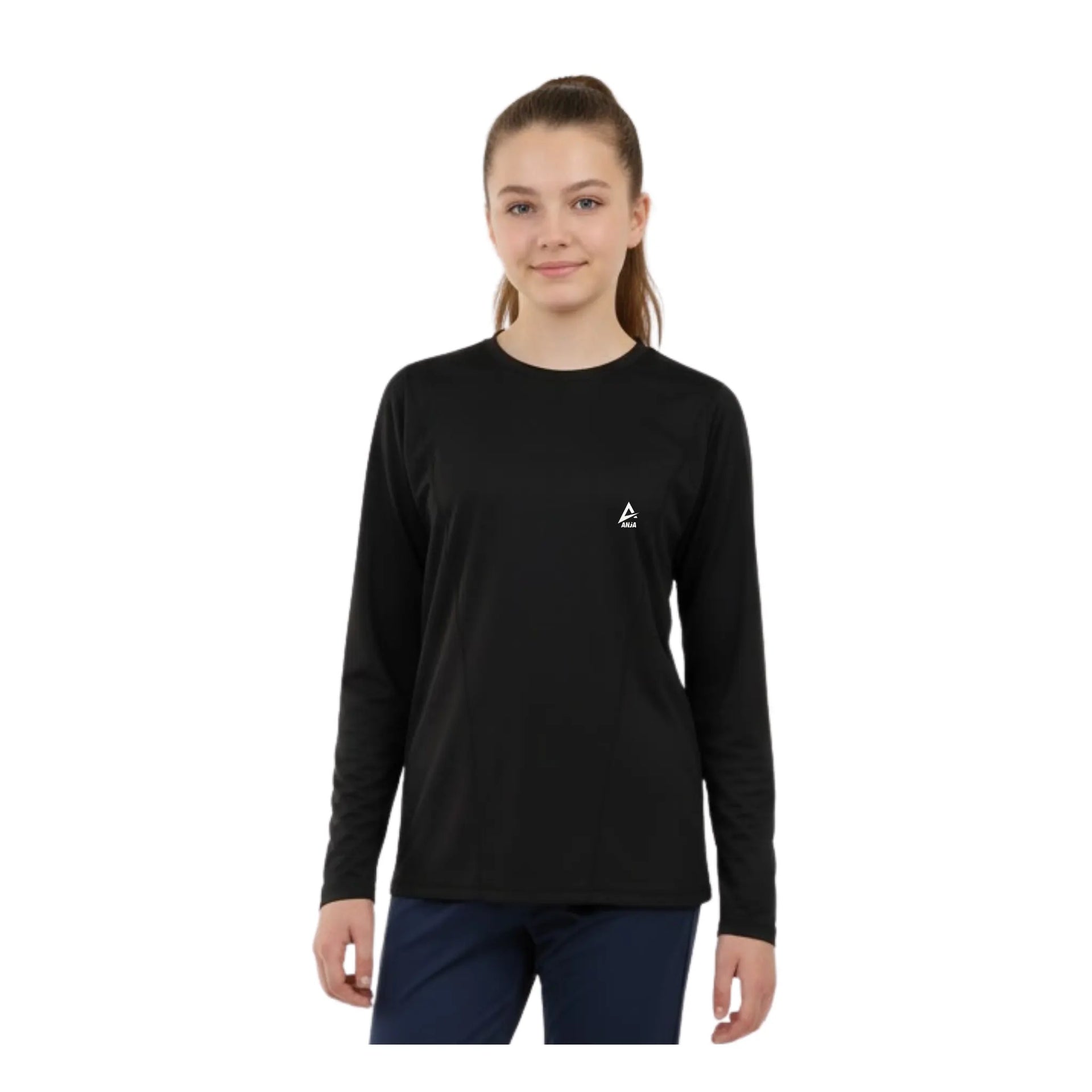 Person wearing a black long-sleeve shirt with a small logo on a white background