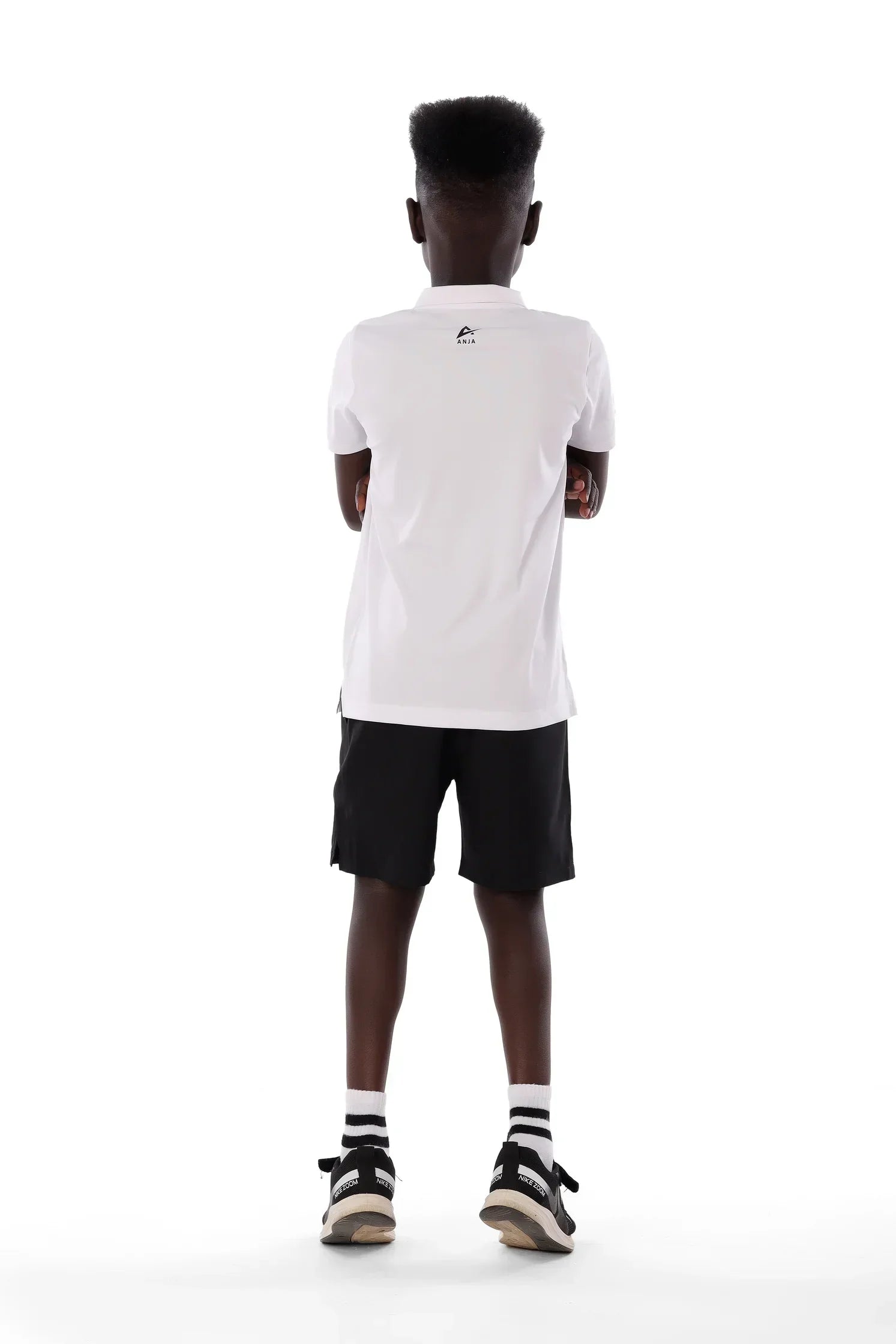 Child wearing a black polo shirt with a logo on the back, white shorts, and black socks with white stripes.