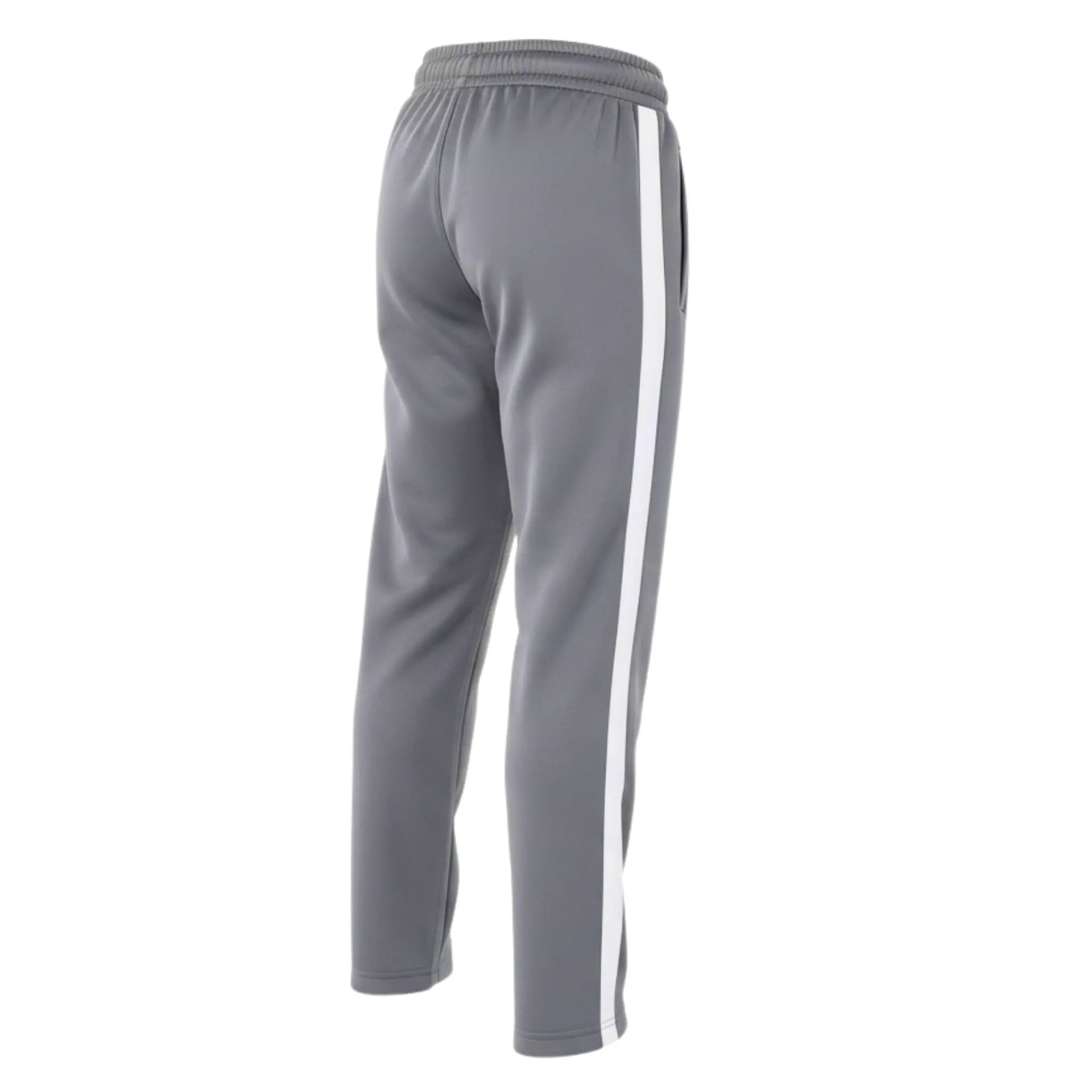 Gray track pants with a white stripe on a white background