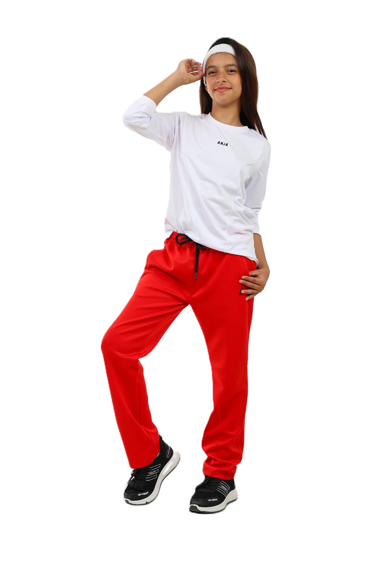 Person wearing a white sweatshirt and red pants on a white background
