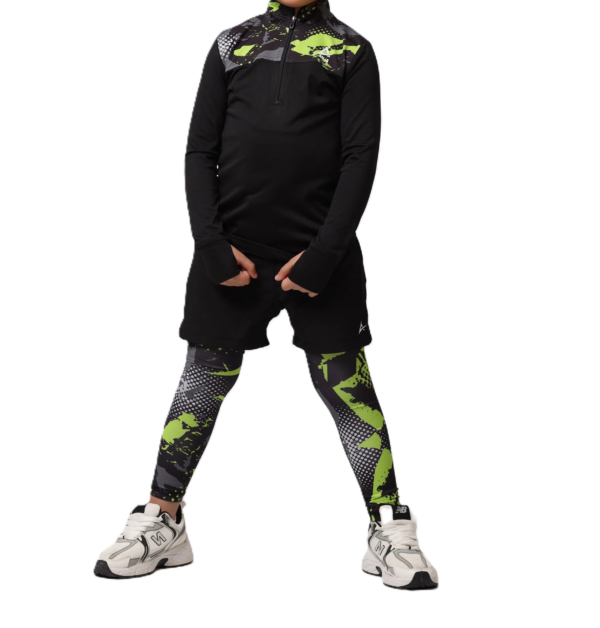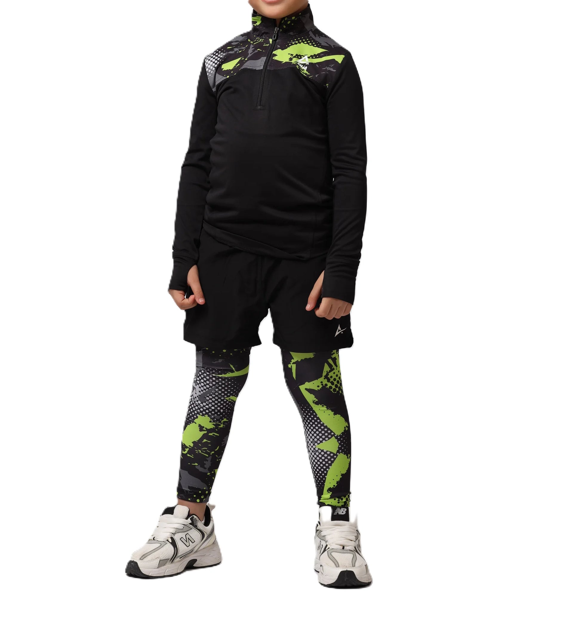 Young girl wearing a black long-sleeve shirt with pink designs, white shorts, pink socks, and black shoes on a white background.
