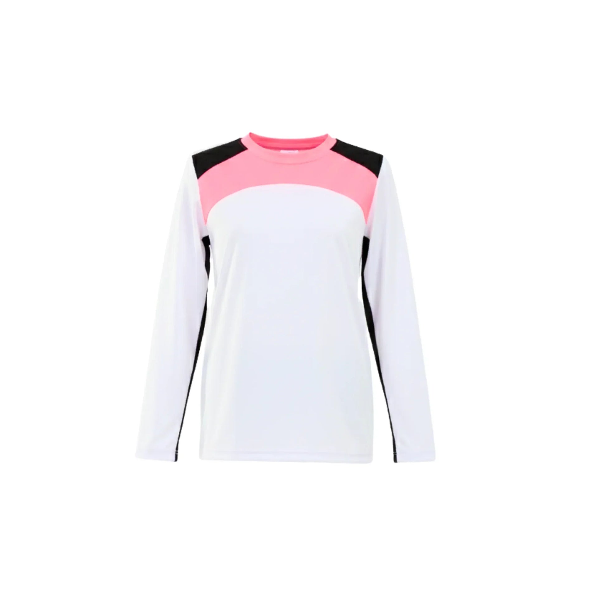 White long-sleeve shirt with pink and black color block design on a white background